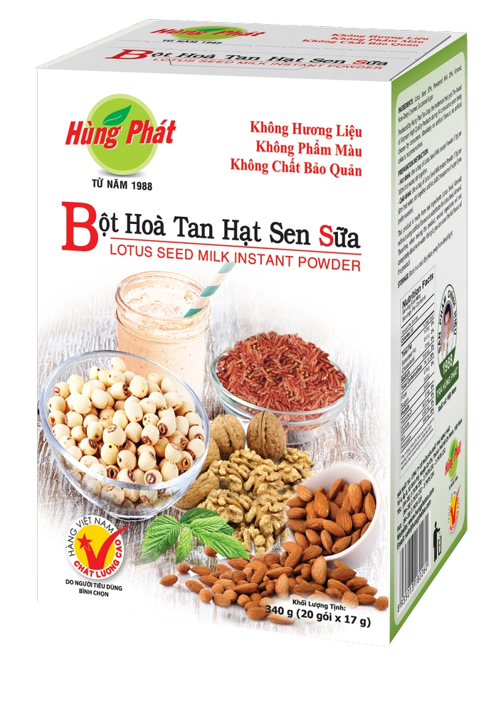 Sản phẩm không phẩm màu, không hương liệu nhân tạo, dạng bột hòa tan tiện lợi, có thể pha nóng hoặc lạnh tùy khẩu vị. Một tách Bột Hòa Tan Hạt Sen Hùng Phát là lựa chọn nhẹ nhàng, dinh dưỡng và tinh tế cho những ai yêu thích vị tự nhiên, mộc mạc mỗi ngày.