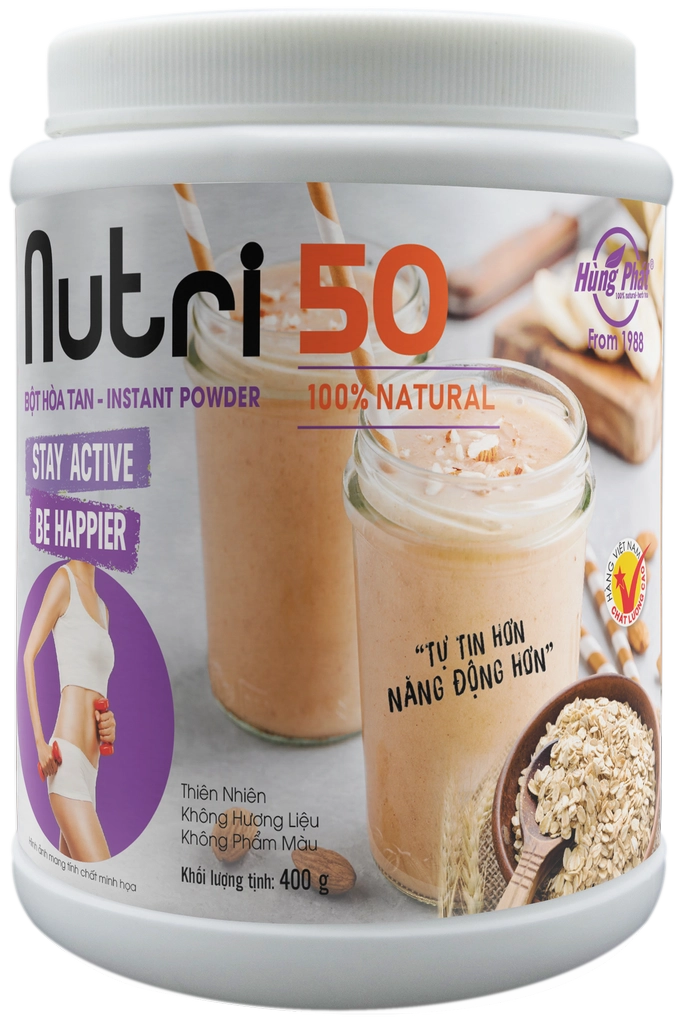 Nutri 50 là dòng bột thực dưỡng hòa tan được thiết kế dành riêng cho người từ 50 tuổi trở lên, giúp bổ sung năng lượng tự nhiên và duy trì sự dẻo dai mỗi ngày. Sản phẩm kết hợp yến mạch cùng các loại hạt, đậu và rau củ thực dưỡng, mang đến hương vị thơm nhẹ, dễ uống và dễ hấp thu.