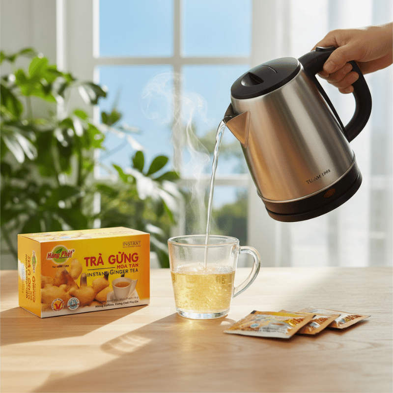 Nước nóng là yếu tố then chốt khi pha trà gừng. Với Trà Gừng Hòa Tan Hùng Phát, nước nên đạt nhiệt độ cao để kích hoạt hương thơm gừng rõ ràng hơn. Khi nước đủ nóng, ngay lúc khuấy trà, mùi thơm gừng già sẽ lan tỏa nhẹ nhàng. Đây là khoảnh khắc nhiều người yêu thích nhất khi pha trà gừng – trước cả khi uống.