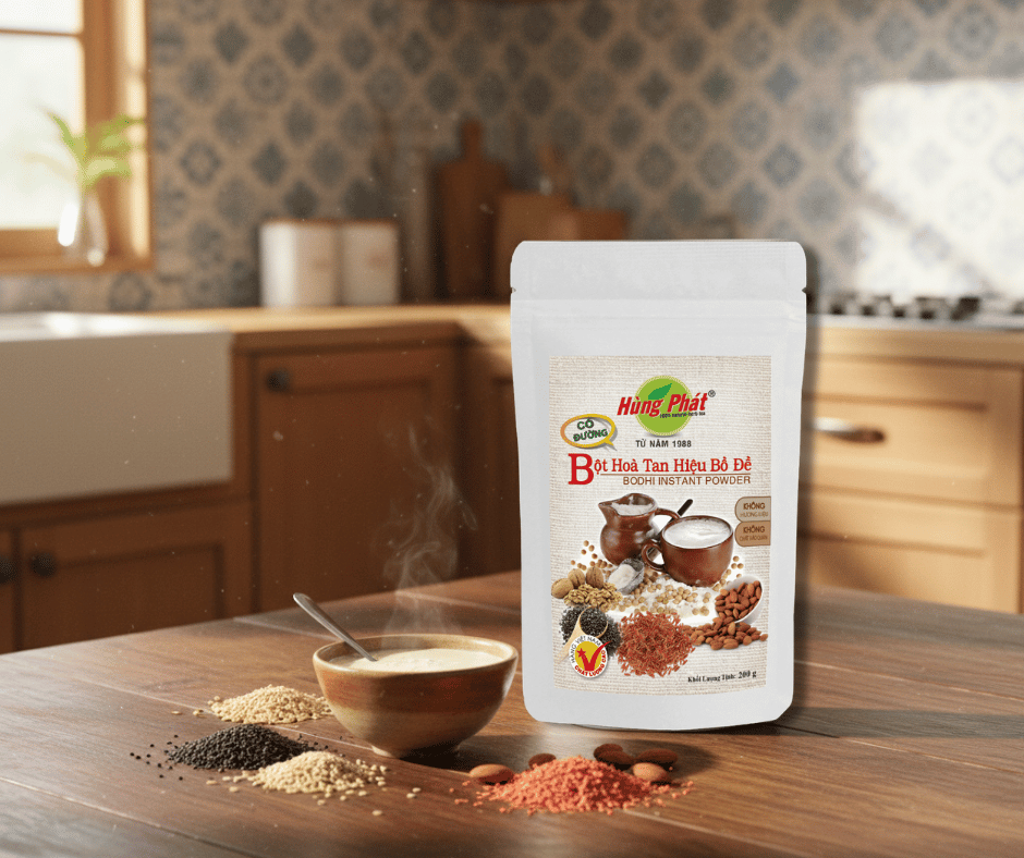 Bột Hòa Tan Hiệu Bồ Đề với thành phần từ gạo lứt, hạt sen, hạnh nhân, mè, bột sắn dây cùng kem không sữa và lượng đường cân đối mang đến sự quen thuộc. Người lớn tuổi có thể dùng như bữa phụ nhẹ nhàng, người trẻ có thể sử dụng giữa giờ làm việc, người ăn chay có thêm một lựa chọn thực vật thuận tiện.