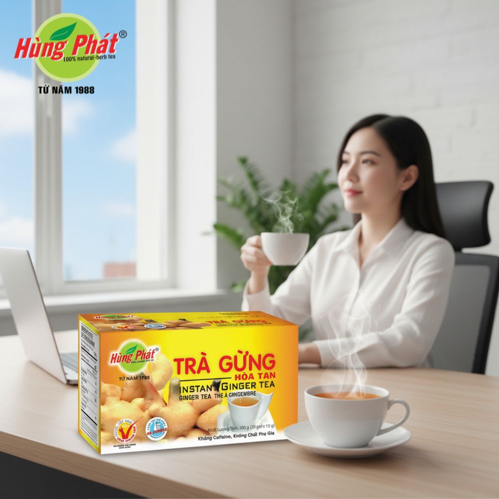 Một chiếc cốc đặt cạnh laptop, một ngụm trà giữa lúc đang làm việc, đôi khi lại là chi tiết khiến buổi làm việc bớt khô cứng hơn. Trà Gừng Hòa Tan phù hợp trong hoàn cảnh này vì có thể pha nhanh, không mất nhiều bước, và không làm gián đoạn công việc quá lâu.