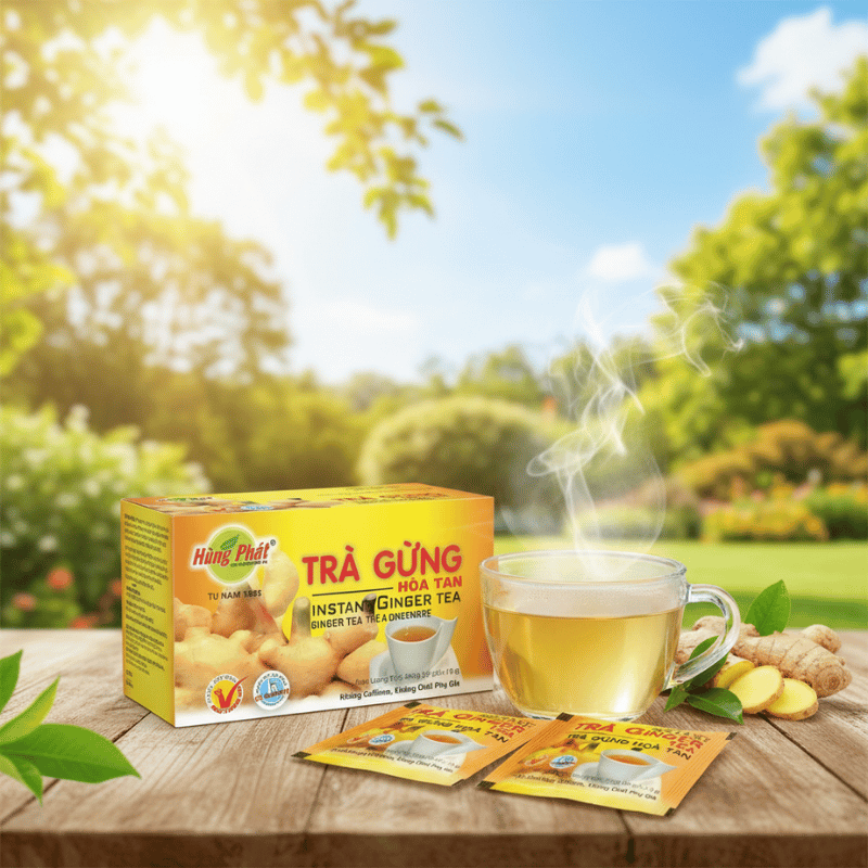 Lối sống tối giản và sự tiện lợi từ gói Trà Gừng Hòa Tan Hùng Phát hiện đại.