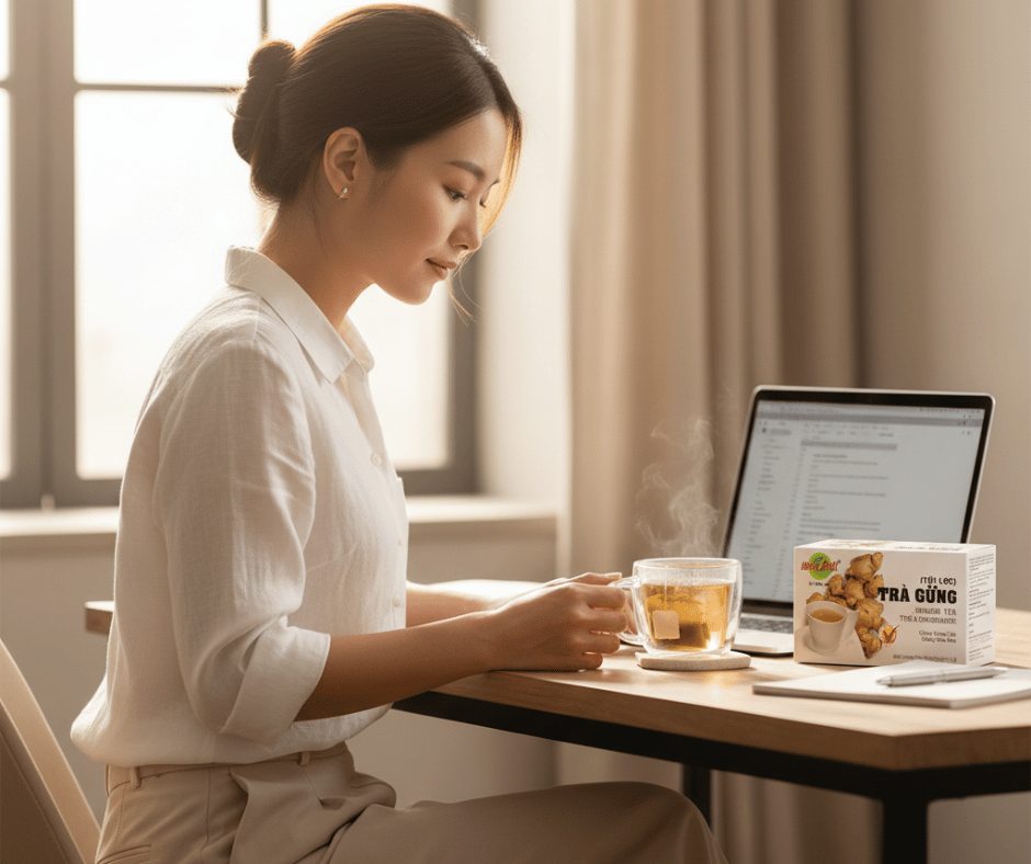 Chính sự tiện lợi này khiến trà gừng túi lọc trở thành lựa chọn quen thuộc tại văn phòng, trong gia đình, hay khi đi công tác, du lịch. Thay vì phải đun nấu, người dùng vẫn giữ được thói quen uống trà gừng nhưng theo cách đơn giản hơn.